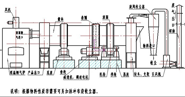 直熱式回轉(zhuǎn)滾筒干燥機(jī)主要由熱源、上料機(jī)、進(jìn)料機(jī)、回轉(zhuǎn)滾筒、出料機(jī)、引風(fēng)機(jī)、卸料器和配電柜構(gòu)成。脫水后的濕物料進(jìn)入干燥機(jī)后,在滾筒內(nèi)均布的抄板的翻動下,物料在干燥機(jī)內(nèi)均勻分散與熱空氣充分接觸,加快了干燥傳熱﹑傳質(zhì)。在干燥過程中,物料在帶有傾斜度的抄板和熱氣質(zhì)的作用下,至干燥機(jī)另一段卸料器排出成品。適合于滑石粉的烘干。