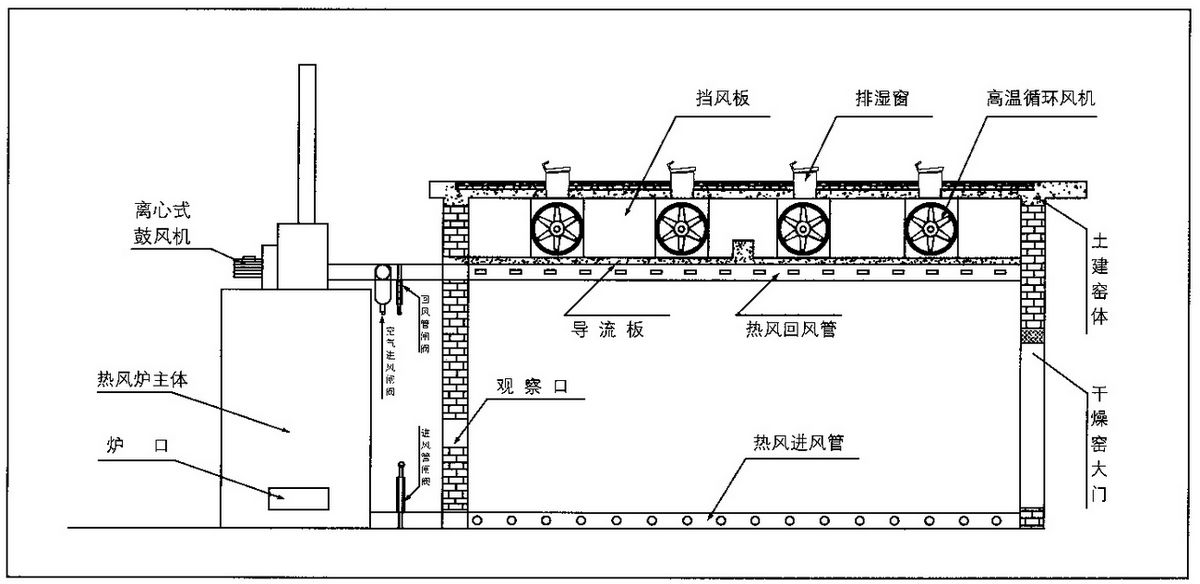 熱風(fēng)式干燥設(shè)備工作原理是利用燃燒產(chǎn)生的熱能,加熱窯內(nèi)的空氣,由熱風(fēng)爐頂部主風(fēng)機(jī)將窯內(nèi)的空氣通過(guò)管道吸入爐體,將空氣加熱。再通過(guò)管道,送入窯內(nèi),由窯內(nèi)的循環(huán)風(fēng)機(jī)不斷的循環(huán)對(duì)窯內(nèi)的木材均勻加熱。木材干燥過(guò)程中如需要蒸汽,可由熱風(fēng)爐內(nèi)的蒸汽發(fā)生器提供,如果是一爐兩房或多房時(shí),管道上裝有插閥,通過(guò)插閥的調(diào)節(jié)來(lái)控制窯內(nèi)的溫度。在干燥的過(guò)程中,由于木材要進(jìn)行排濕,在窯頂上留有排濕孔(根據(jù)地區(qū)而定)和裝有抽濕機(jī),用來(lái)調(diào)節(jié)排濕的快慢.